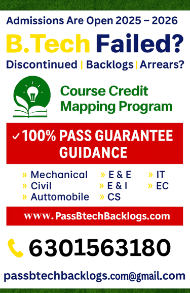 Struggling with B.Tech backlogs in Telangana or Andhra Pradesh? Get expert guidance with 100% pass support from PassBtechBacklogs.com. . Call +91-6301563180 for instant help.
